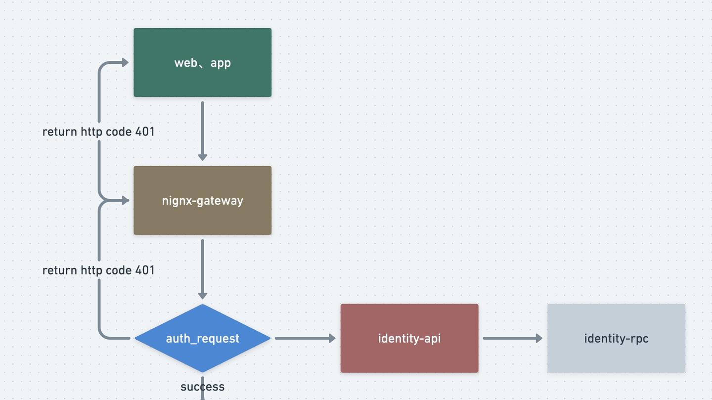 当我们在访问用户服务时候, http://127.0.0.1:8888/usercenter/v1/user/detail , 访问了外部端口8888,然后映射到nginx内部looklook网关8081上,然后location匹配到了/usercenter/ ,在该模块开始有一行 auth_request /auth, 所以nginx不会直接去请求http://usercenter-api:8002 , 而是会先跳到 location /auth 模块中,auth模块会访问 http://identity-api:8001/identity/v1/verify/token; ,identity-api也是我们内部的服务,是由我们自己写的鉴权服务,实际也是用的go-zero的jwt
